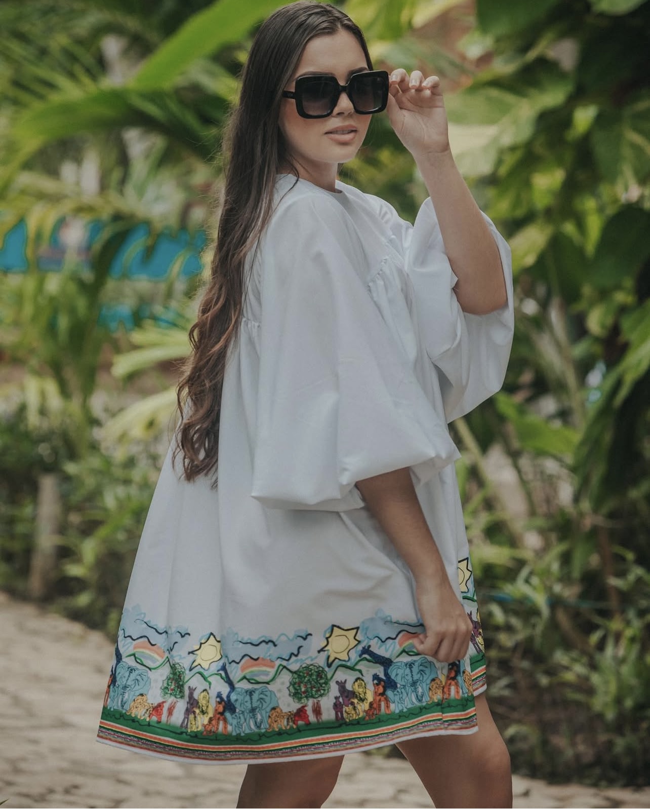 Elaborada en Atina , corte sesgado CUELLO ALTO, , manga abucheada con puño resortado, y bolero al finalizar el vestido. La técnica es SUBLIMACIÓN