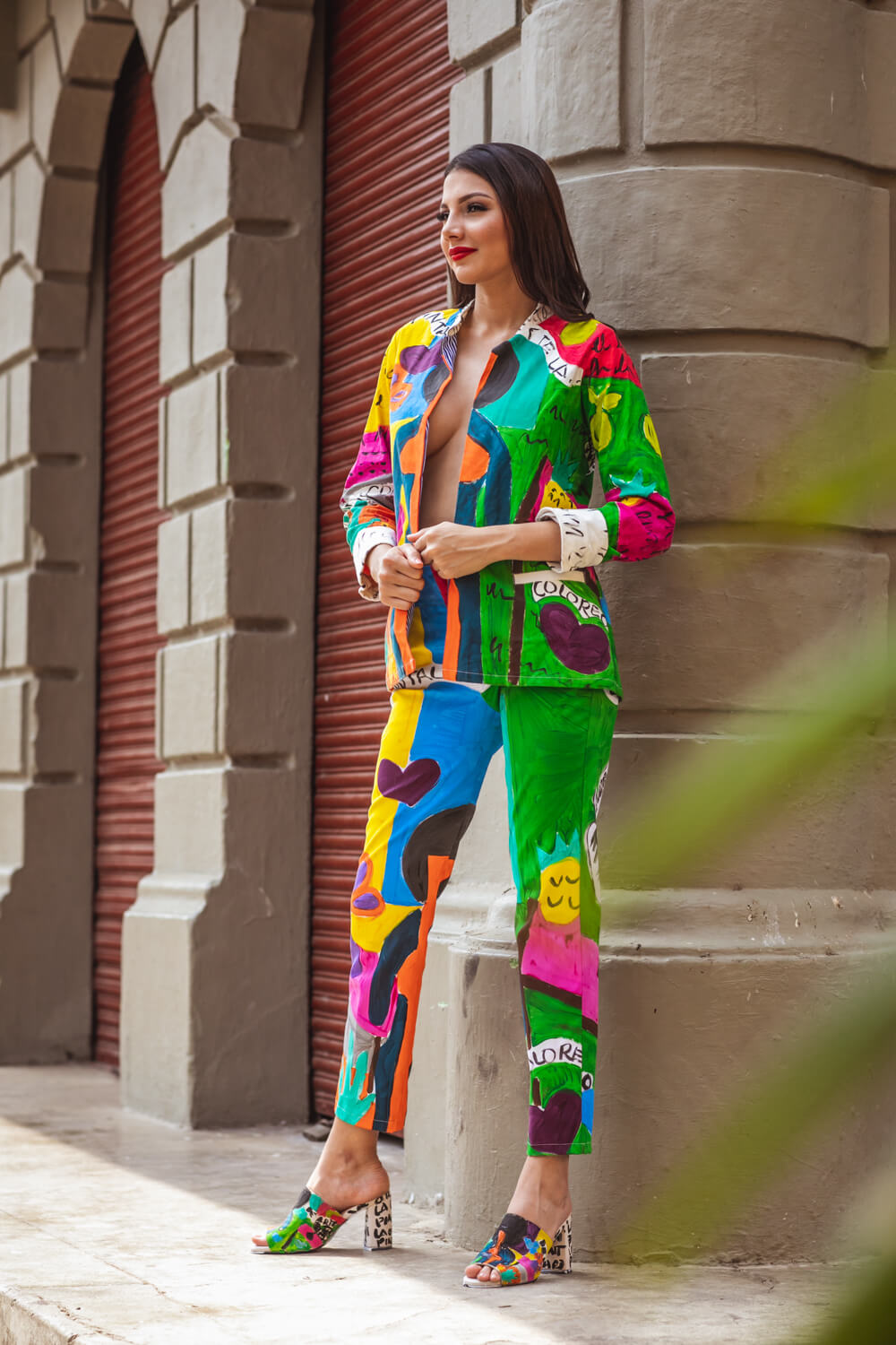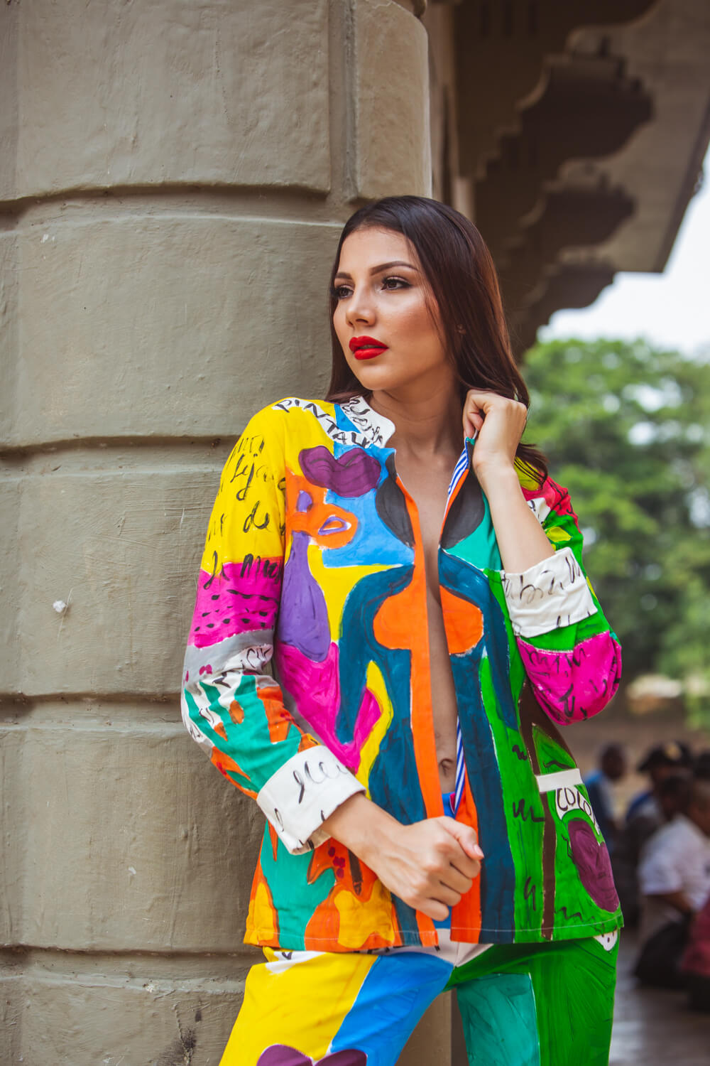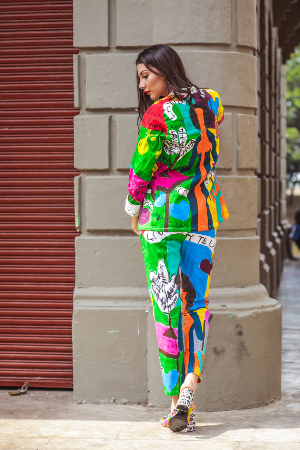 Elaborada en Dril stretch , corte solapa, forrado, bolsillos ojales. La técnica es pintura sobre textiles,los print son pintados sobre la tela y luego tienen su proceso de sellado.