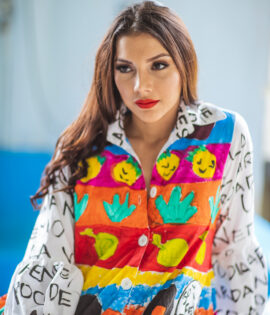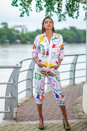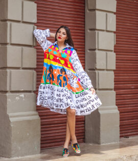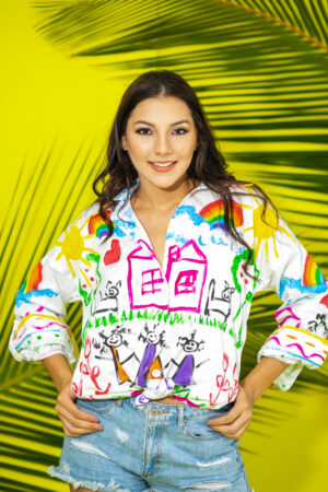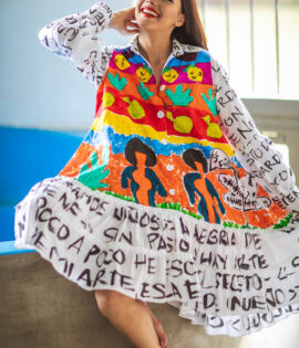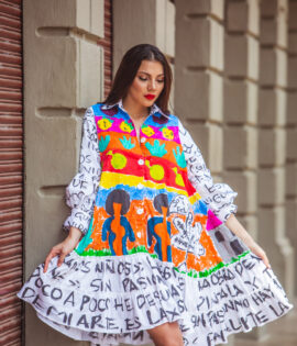 CHAQUETA DOBLE FAZ: UN LADO TOTALMENTE PINTADO A MANO CON TRAZOS DE FUERZA Y LA EXPRESION MAXIMA DEL COLOR Y EL OTRO LADO ENCAJE NEGRO SIMBOLO DE ELEGANCIA Y SOFISTICACION CON APLIQUES EMBLEMATICOS DE LA COLECCION, ESTA PIEZA ENCARNA LA TRANFORMACION . UNA PROPUESTA SOFISTICADA PARA MUJERES QUE VIVEN ENTRE LA ESTRUCTURA Y LA LIBERTAD.