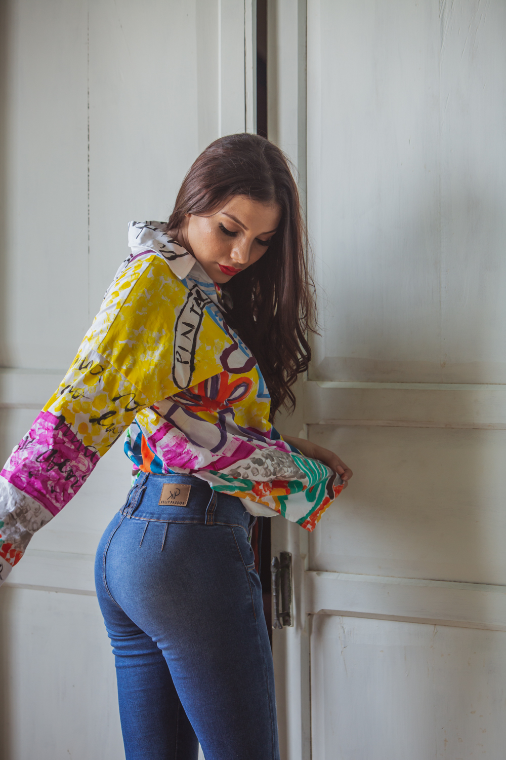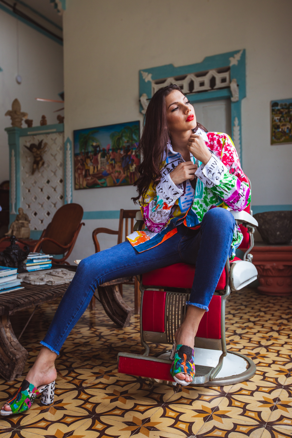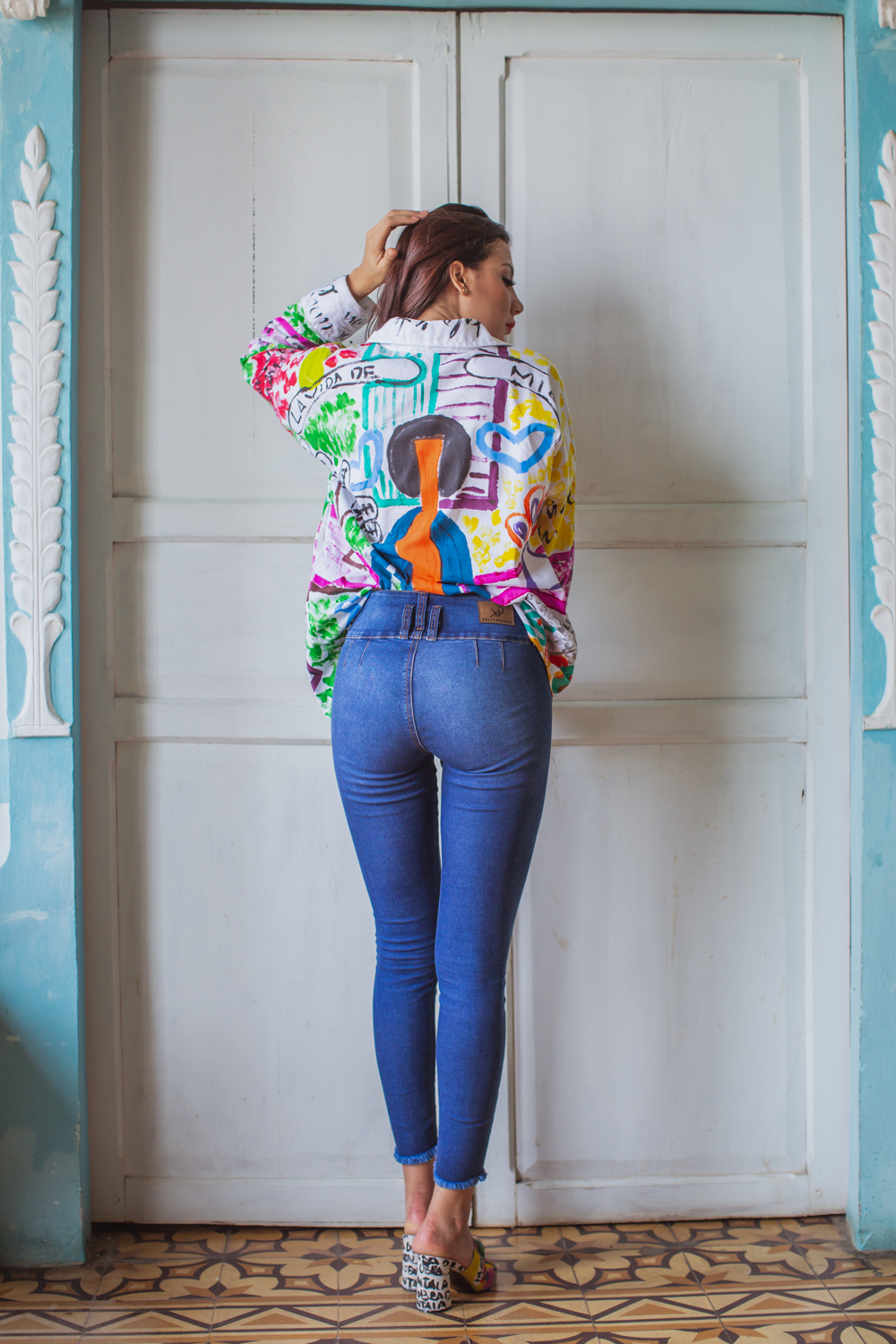 Elaborada en algodón stretch, corte oversize silueta amplia y bolsillos laterales ,La técnica es pintura sobre textiles,los print son pintados sobre la tela y luego tienen su proceso de fijación y sellado.