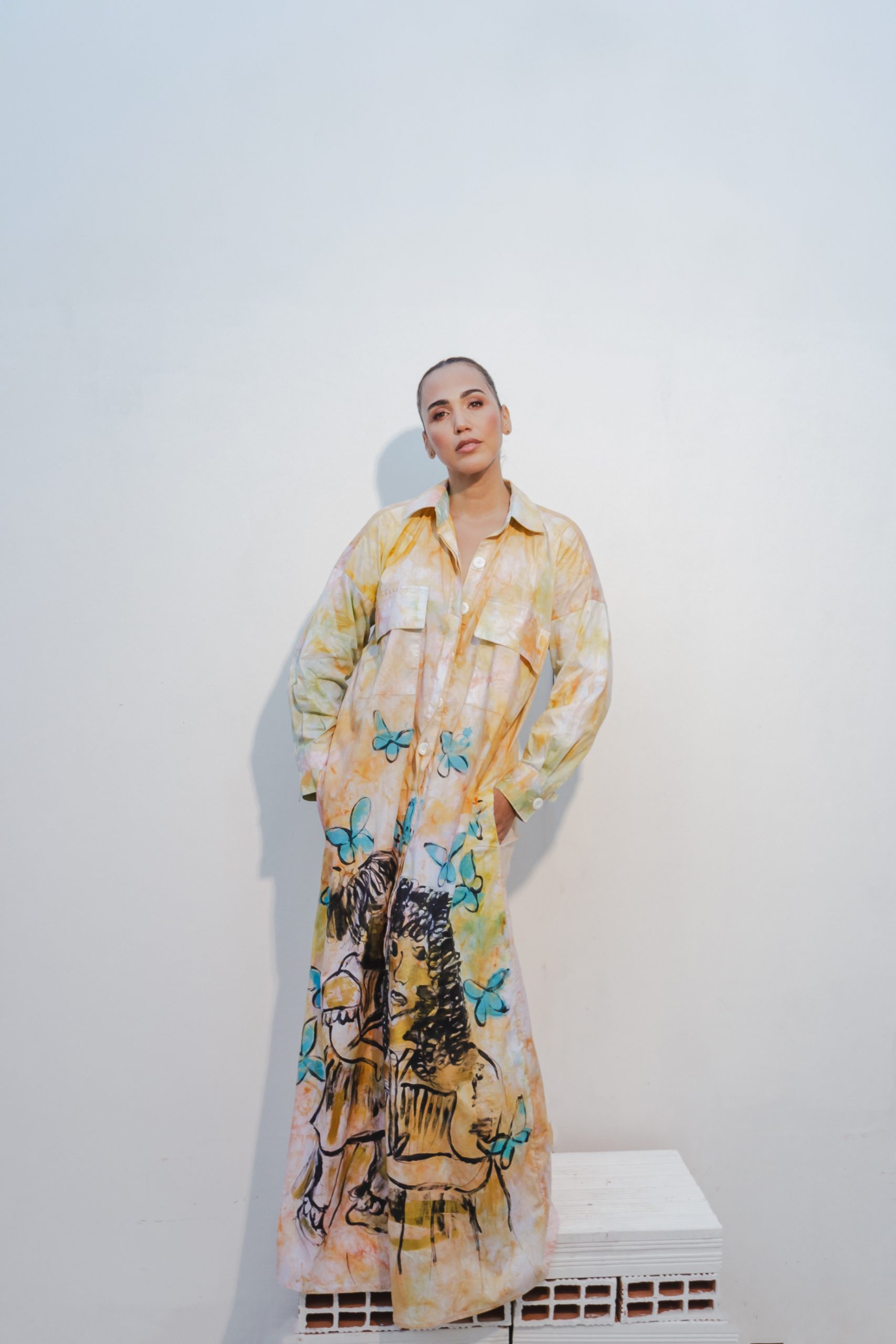 Abrazo de Mariposa” es una obra textil que encapsula la calidez de los recuerdos infantiles y el amor eterno entre madre e hija. Este camisero, elaborado con la técnica de tie-dye en tonos cálidos de naranja, rosa y ocre, evoca la suavidad y la ternura de los momentos compartidos en la niñez.