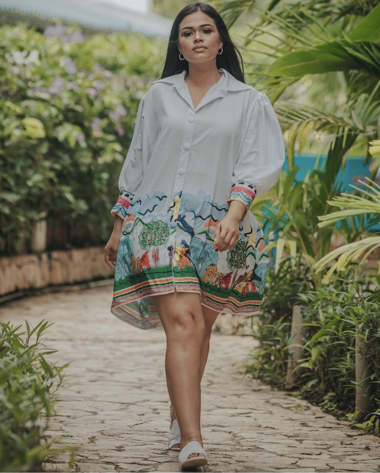 ELABORADO EN ATINA O ITALIANA, CORTE AL SESGO CON VUELO, CUELLO Y MANGAS ABULLONADAS CON PUÑOS TIPO CAMISA Y BOTONADURA FRONTAL CON BOLSILLO LATERALES, . técnica SUBLIMACIÓN TEXTIL.