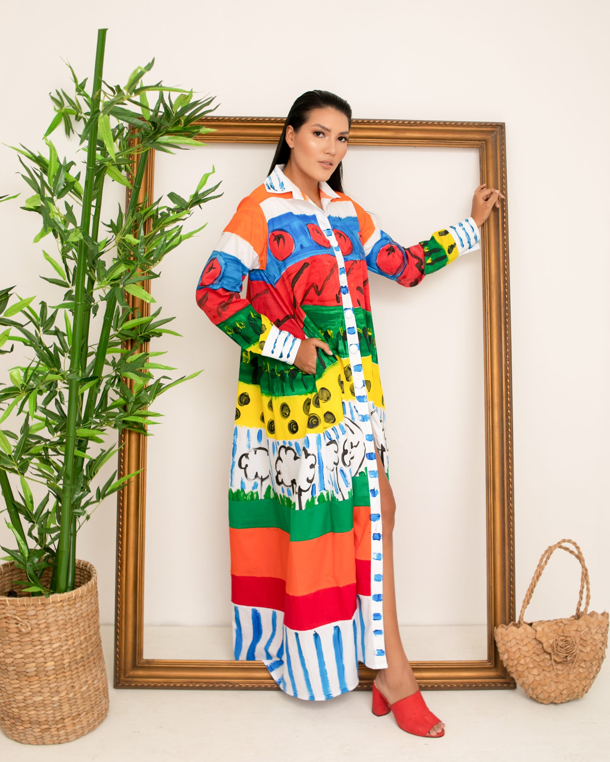 Elaborada en algodón stretch, corte semi sesgo mangas largas, monte de botones frontales cuellos y puños , silueta amplia, tiene bolsillos laterales la técnica es pintura sobre textiles,los print son pintados sobre la tela y luego tienen su proceso de sellado.