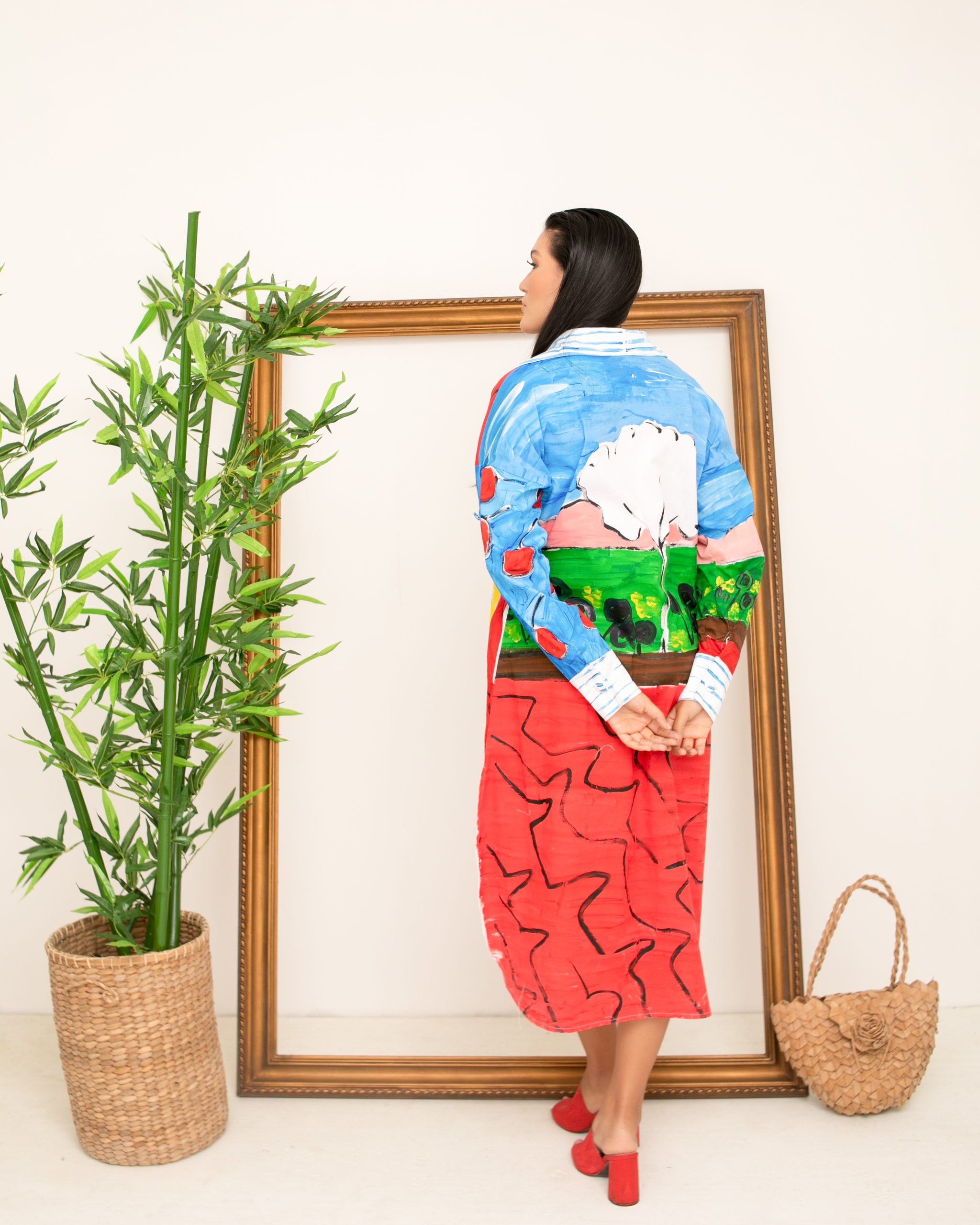 Elaborada en algodón stretch, corte oversize, recto y corto hasta la rodilla ,mangas largas, monte de botones frontales cuellos y puños , silueta amplia, tiene bolsillos laterales la técnica es pintura sobre textiles,los print son pintados sobre la tela y luego tienen su proceso de sellado.