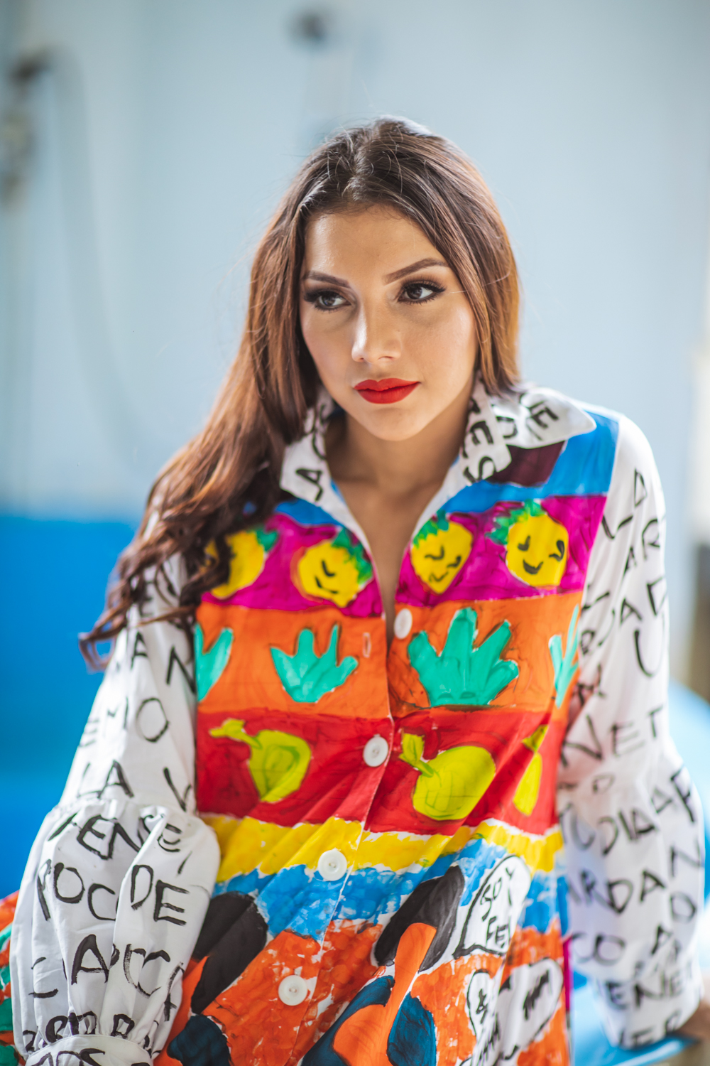 Elaborada en algodón stretch, CORTE OVERSIZE Y BOTONADURA EN LA PARTE FRONTAL CUELLOS Y PUÑOS, LA TELA ES ARMADA CON ZAYAS COMBINADAS PINTADAS A MANO. La técnica es pintura sobre textiles,los print son pintados sobre la tela y luego tienen su proceso de sellado.