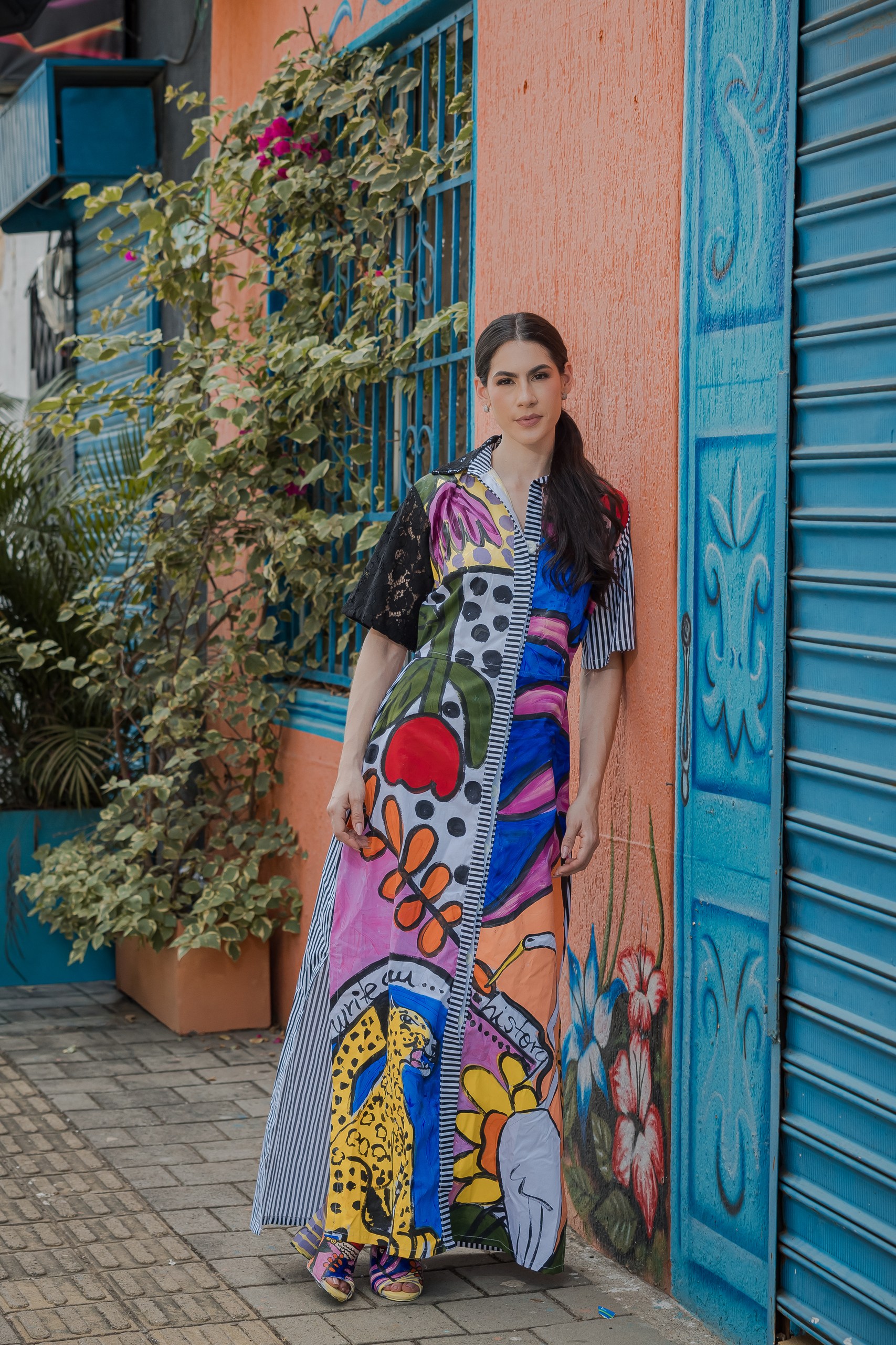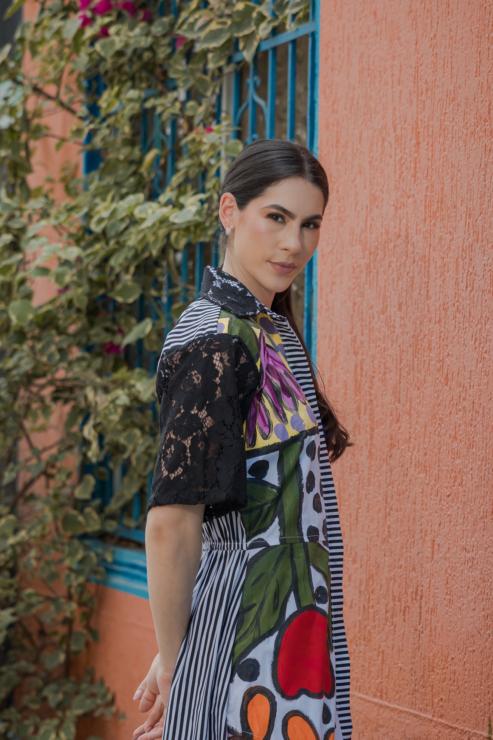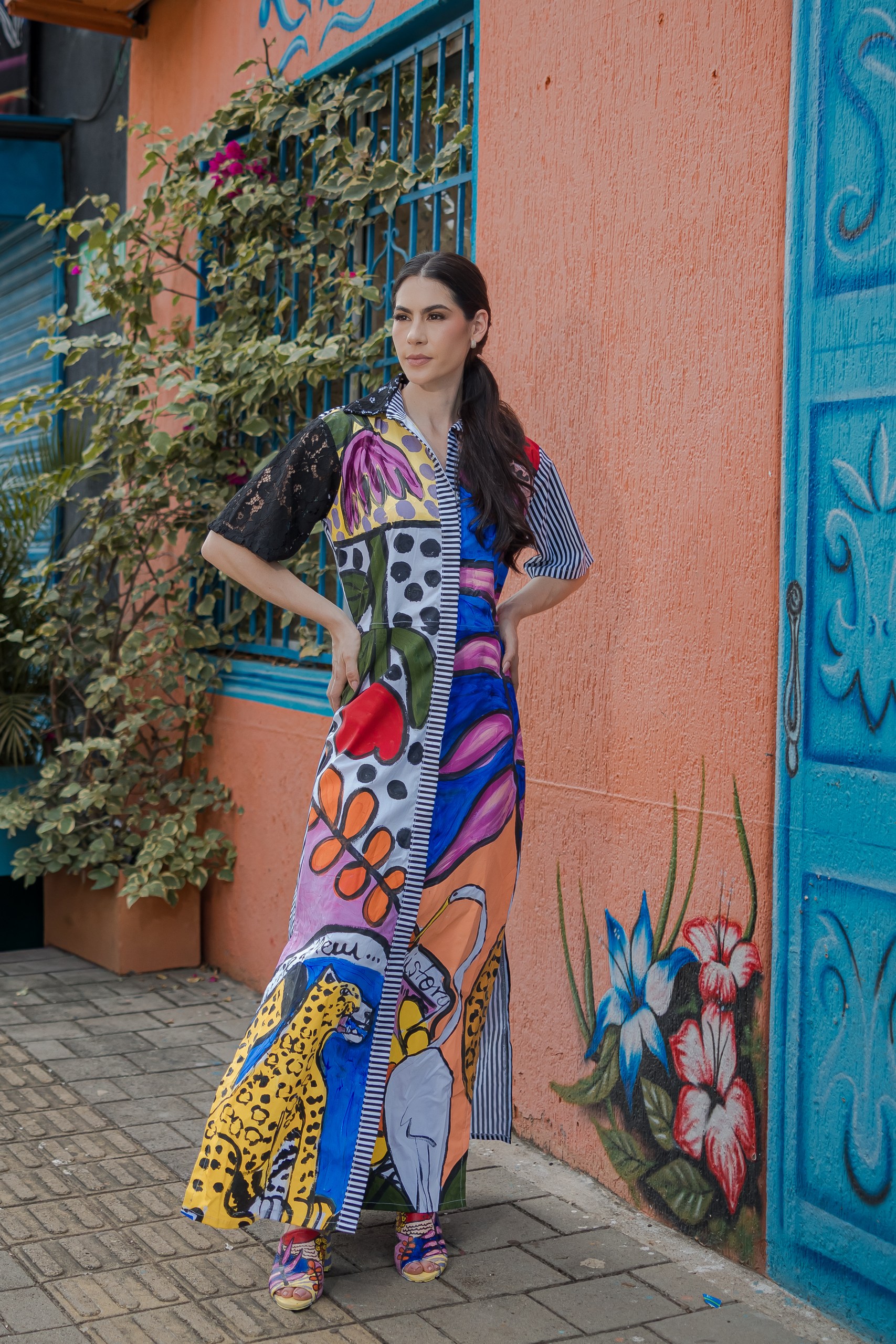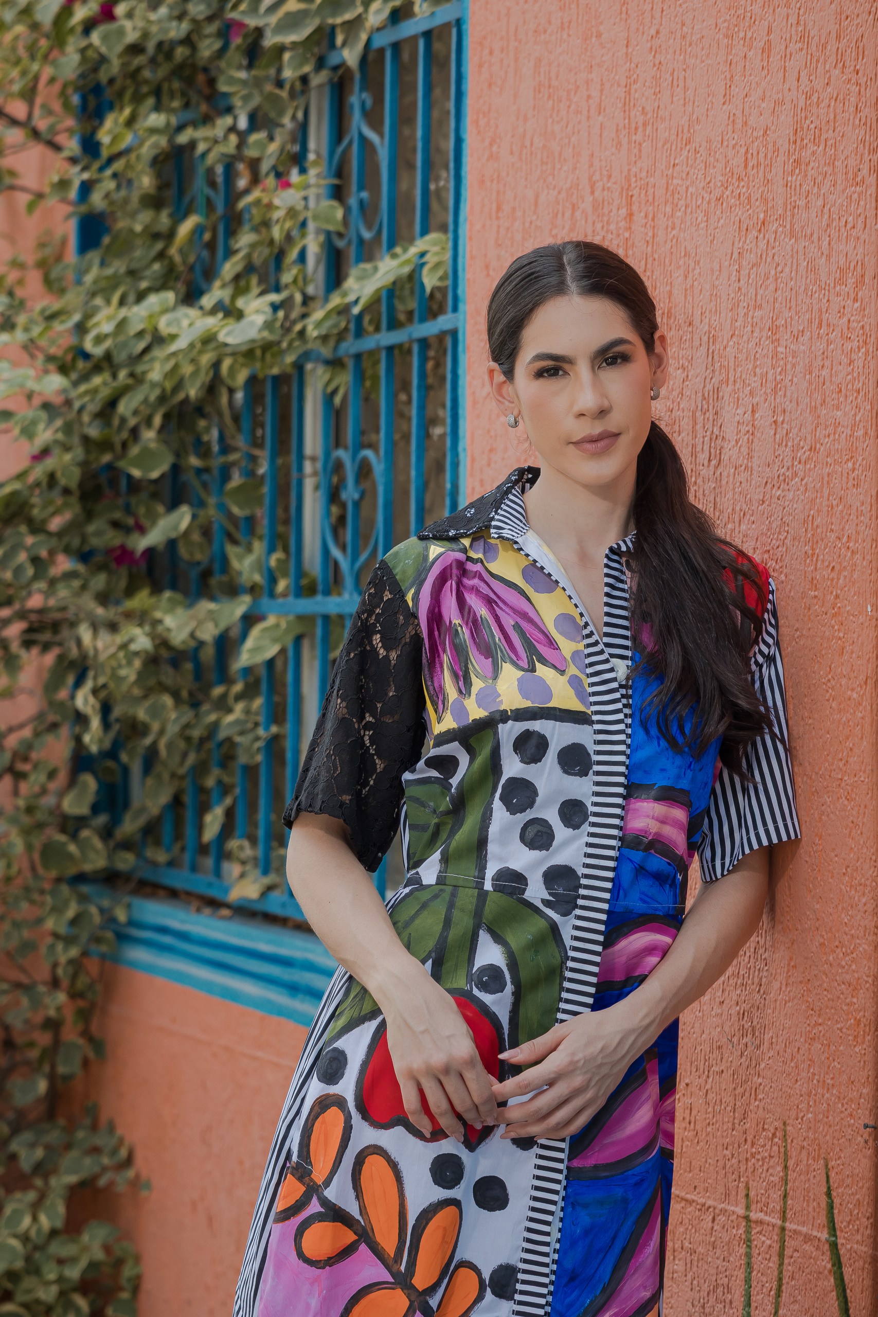 EL CUERPO DE ESTA PIEZA ES PINTADO A MANO COMBINADO CON ENCAJE, MANGAS EN LISTAS Y ENCAJE. SU EFECTO RECUERDA LA LUZ ATRAVESANDO VITRALES, CONECTANDO LA ESPIRITUALIDAD, ARQUITECTURA Y COLOR.