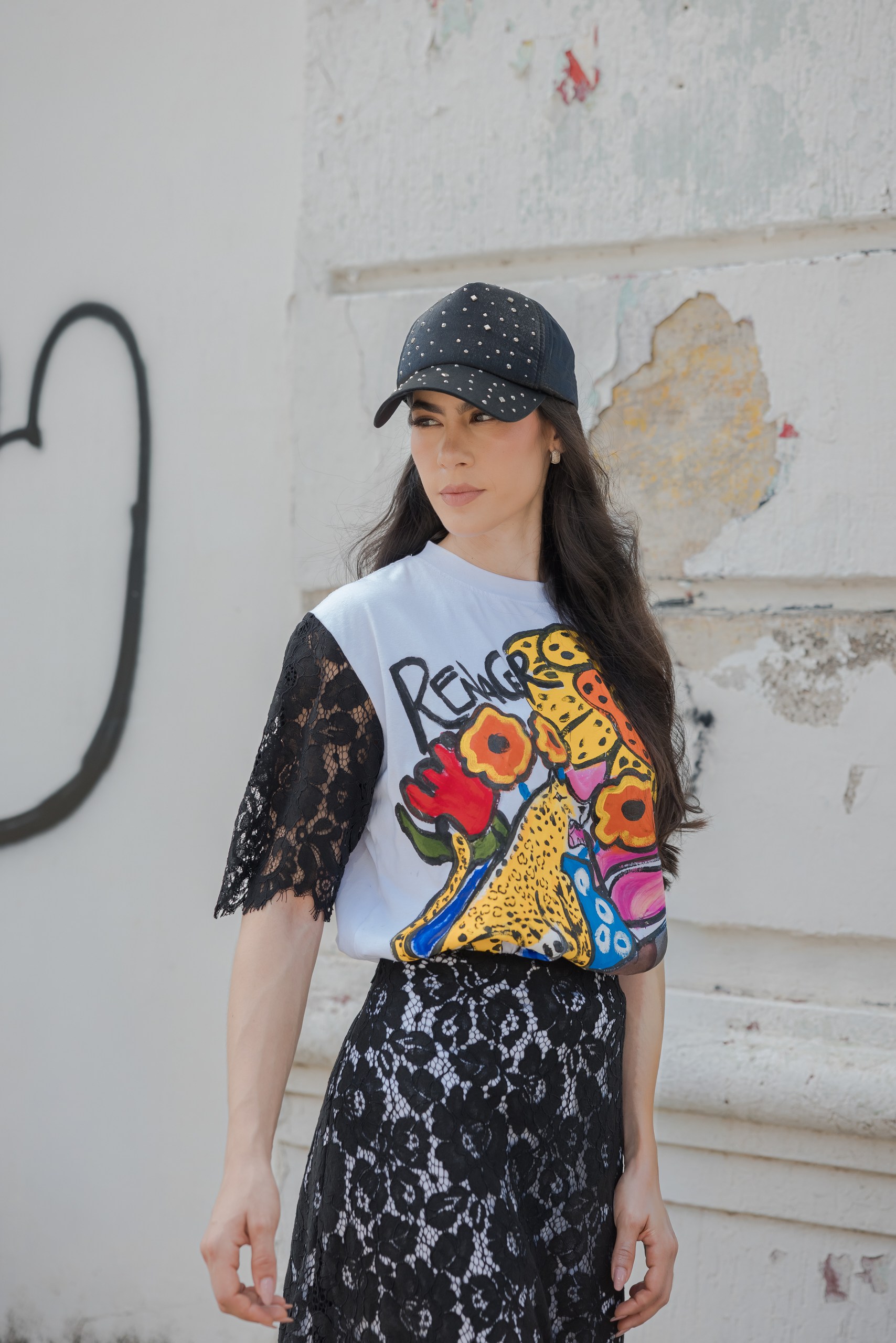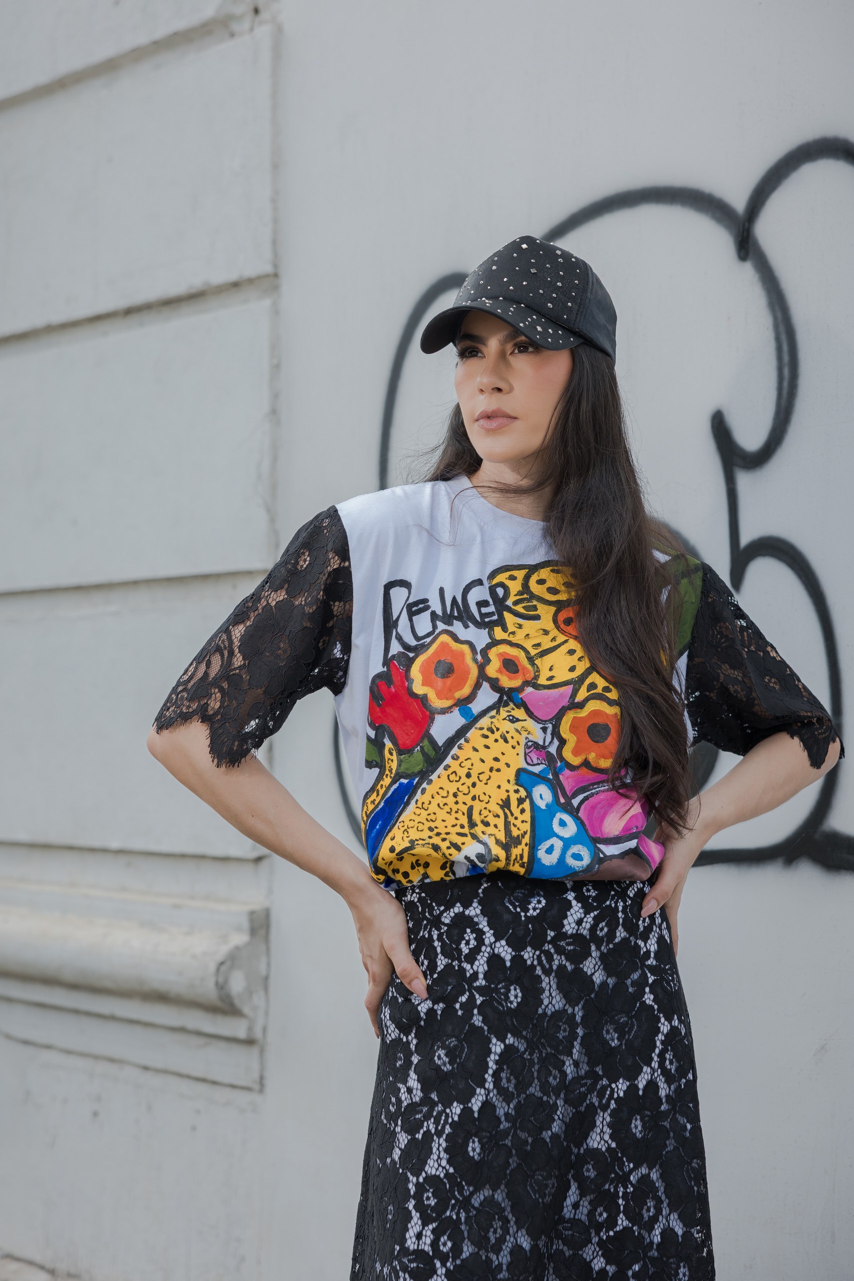 SUETER BLANCO INTERVENIDO CON MANGAS EN ENCAJE Y PRINT PINTADO A MANO.