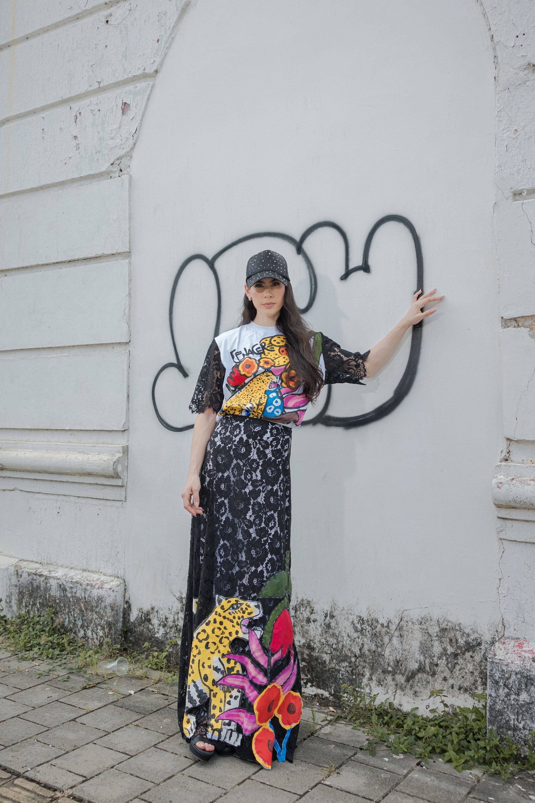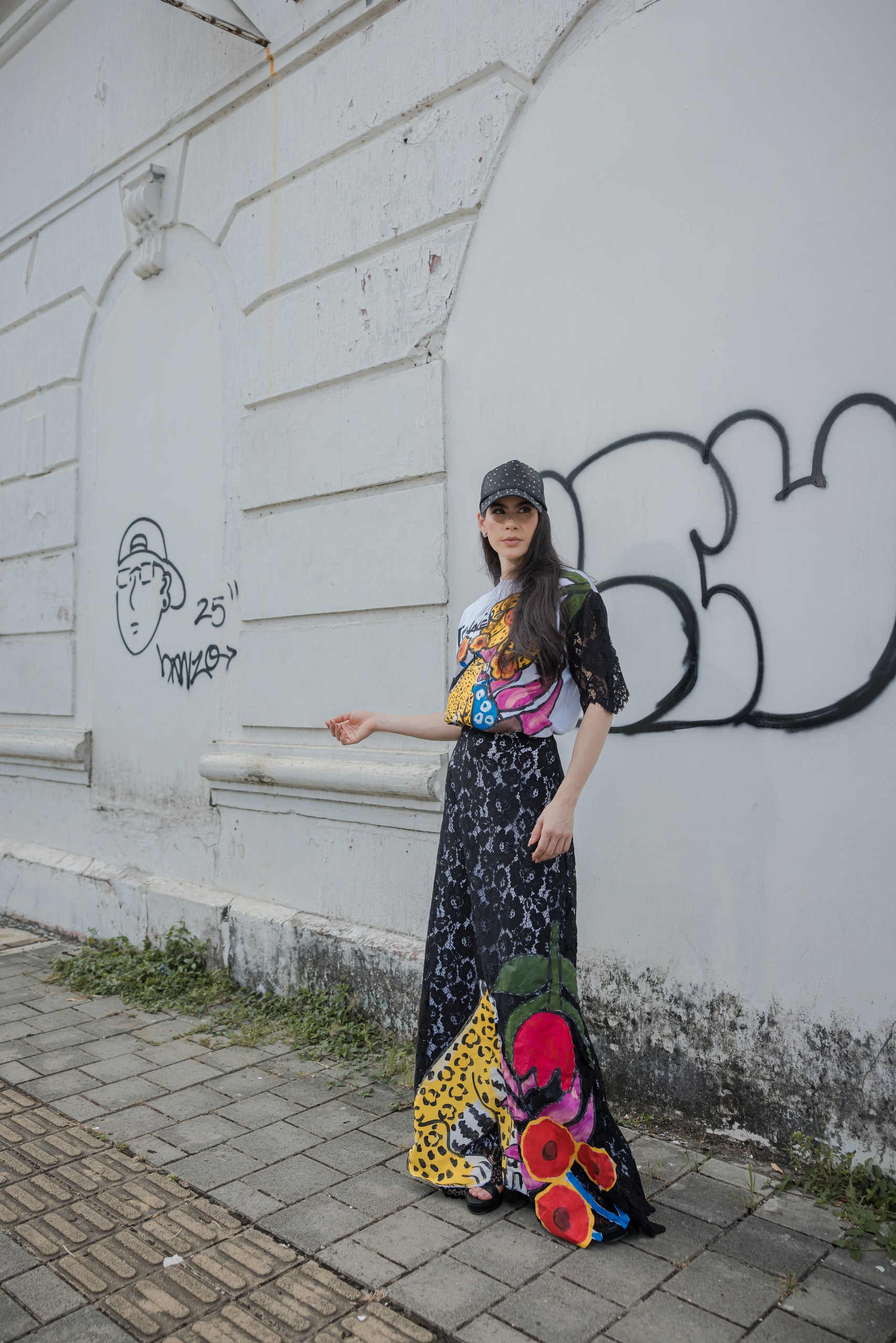 ACOMPAÑADO DE UNA FALDA EN ENCAJE CON FORRO BLANCO Y APLIQUES EMBLEMATICOS DE LA COLECCIÓN. ES UNA PIEZA QUE CAPTURA LA ESENCIA DEL ARTE TEXTIL : TEXTURA, TRAZOS Y LUZ COEXISTIENDO EN UNA MISMA SILUETA.