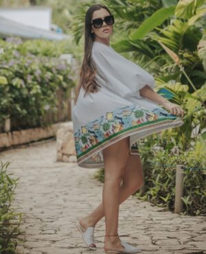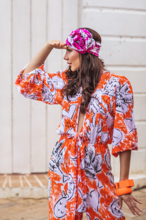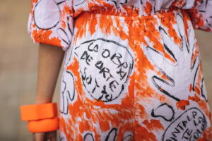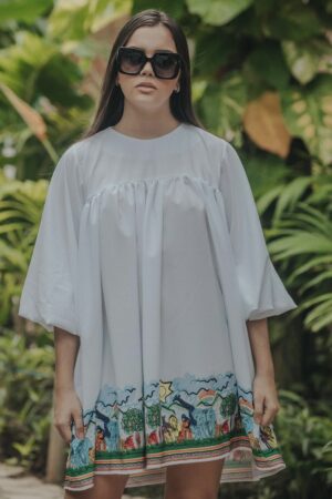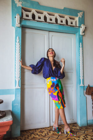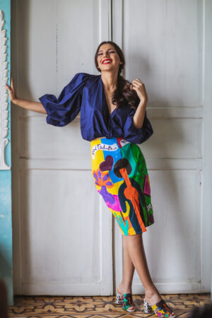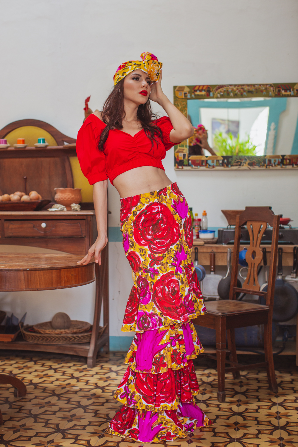 Elaborada en algodón stretch, con silueta ajustada en la parte del canesú hasta debajo de la cadera , el resto de la falda es armado CON BOLEROS SESGADOS EN ESTAMPADOS VARIOS . La técnica es pintura sobre textiles,los print son pintados sobre la tela y luego tienen su proceso de sellado.