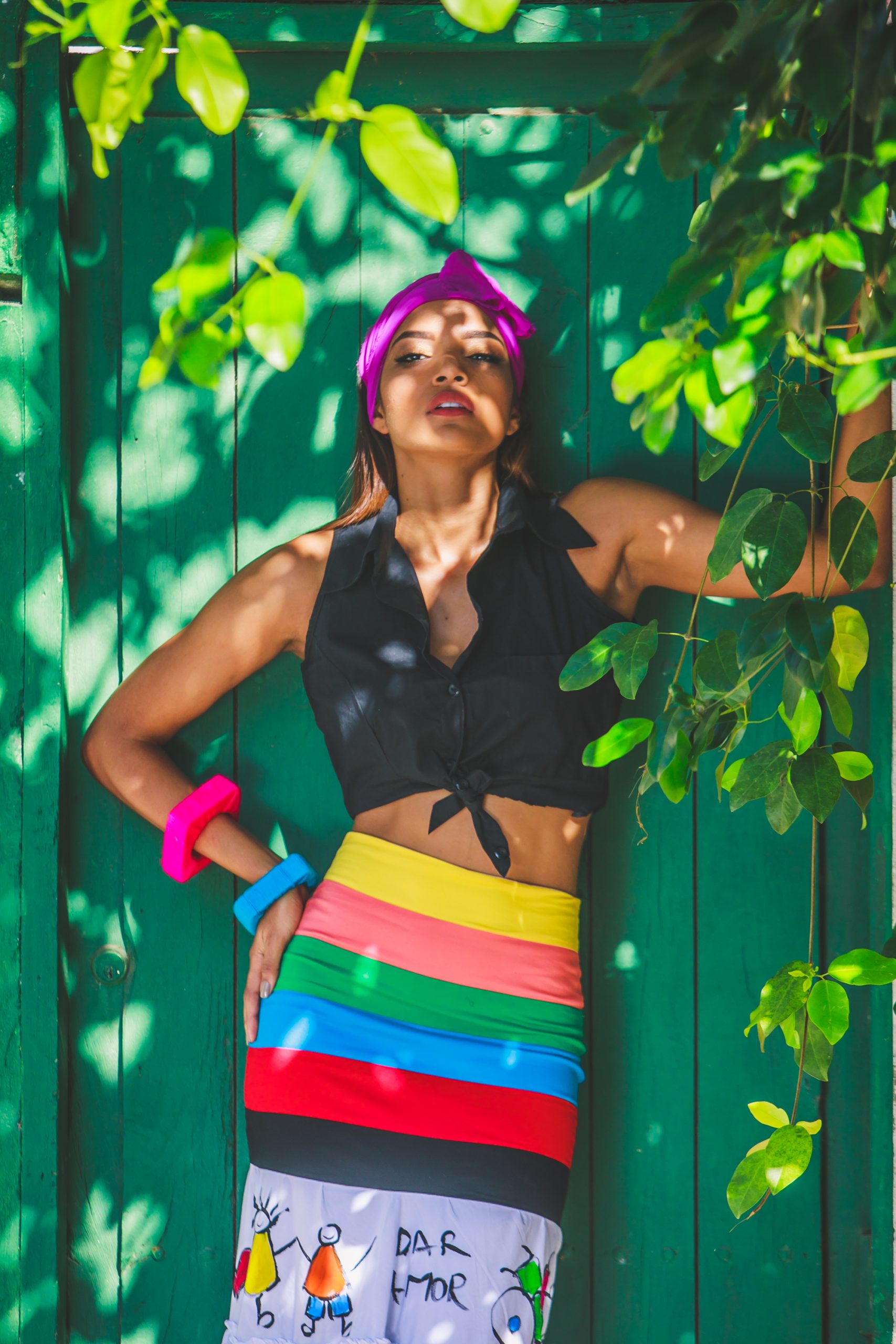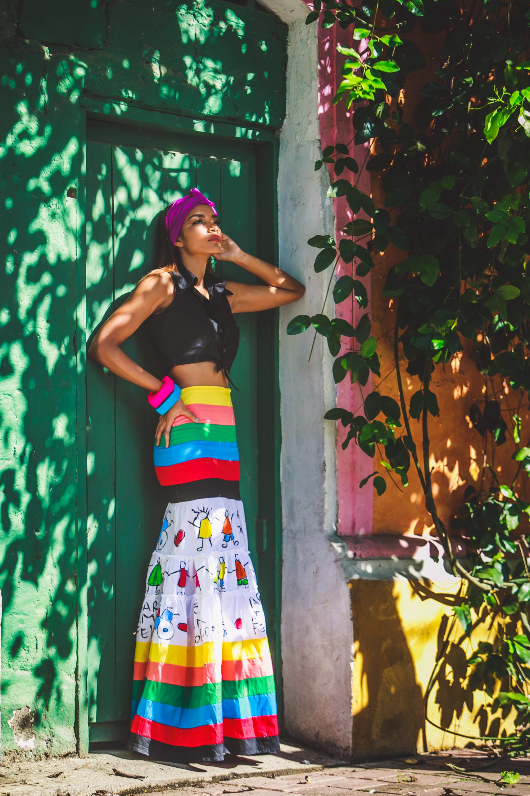 Elaborada en algodón stretch, con silueta ajustada en la parte del canesú hasta debajo de la cadera formado por zayas armada manualmente en telas de colores técnica patchwork, el resto de la falda es armado por sayas pintadas a mano y metidos en zayas de colores de diferente direcciones. La técnica es pintura sobre textiles, los print son pintados sobre la tela y luego tienen su proceso de sellado.