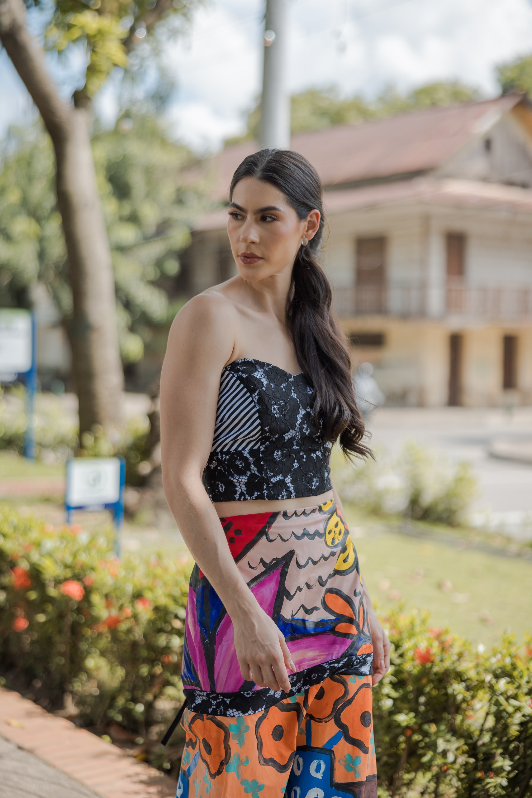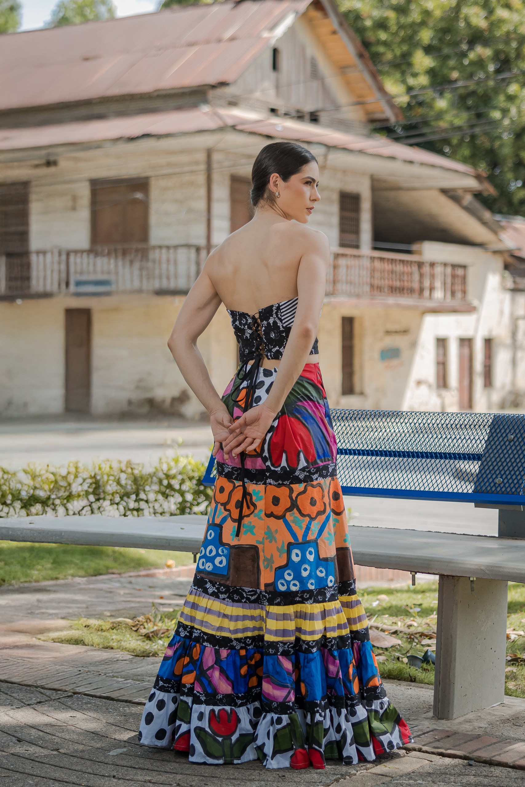 LA FALDA PINTADA CELEBRA LA SIMPLICIDAD DEL TRAZO, MIENTRAS QUE EL BLUSON AMARILLO APORTA ENERGIA Y CLARIDAD
