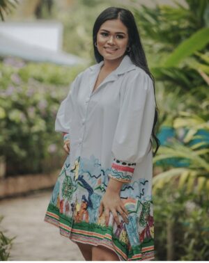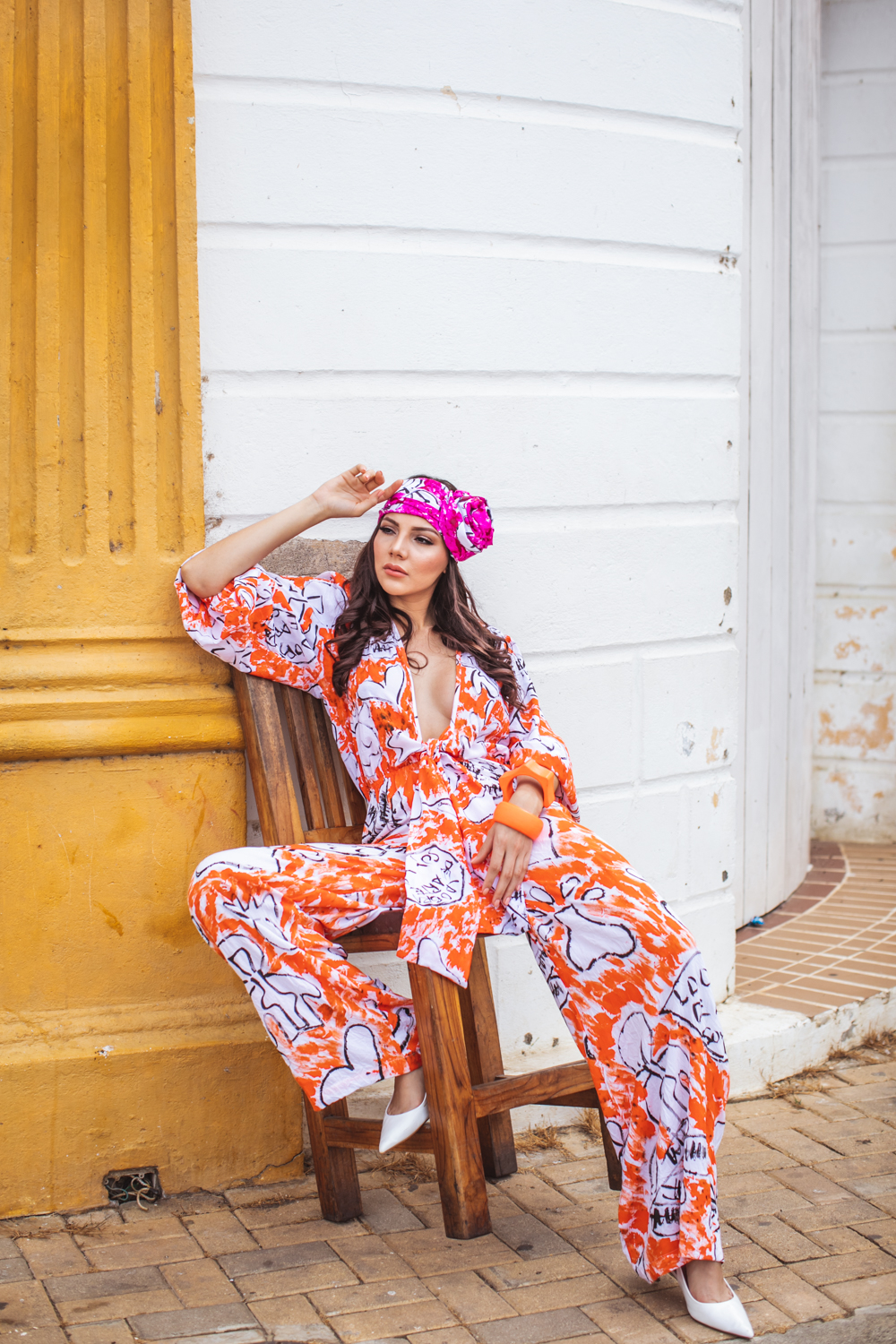 Elaborada en Rayón de algodón , corte en la cintura manga larga y escote profundo y lazo de amarre en la parte frontal pantalón en bota resortada con ELÁSTICO . La técnica es pintura sobre textiles,los print son pintados sobre la tela y luego tienen su proceso de sellado..