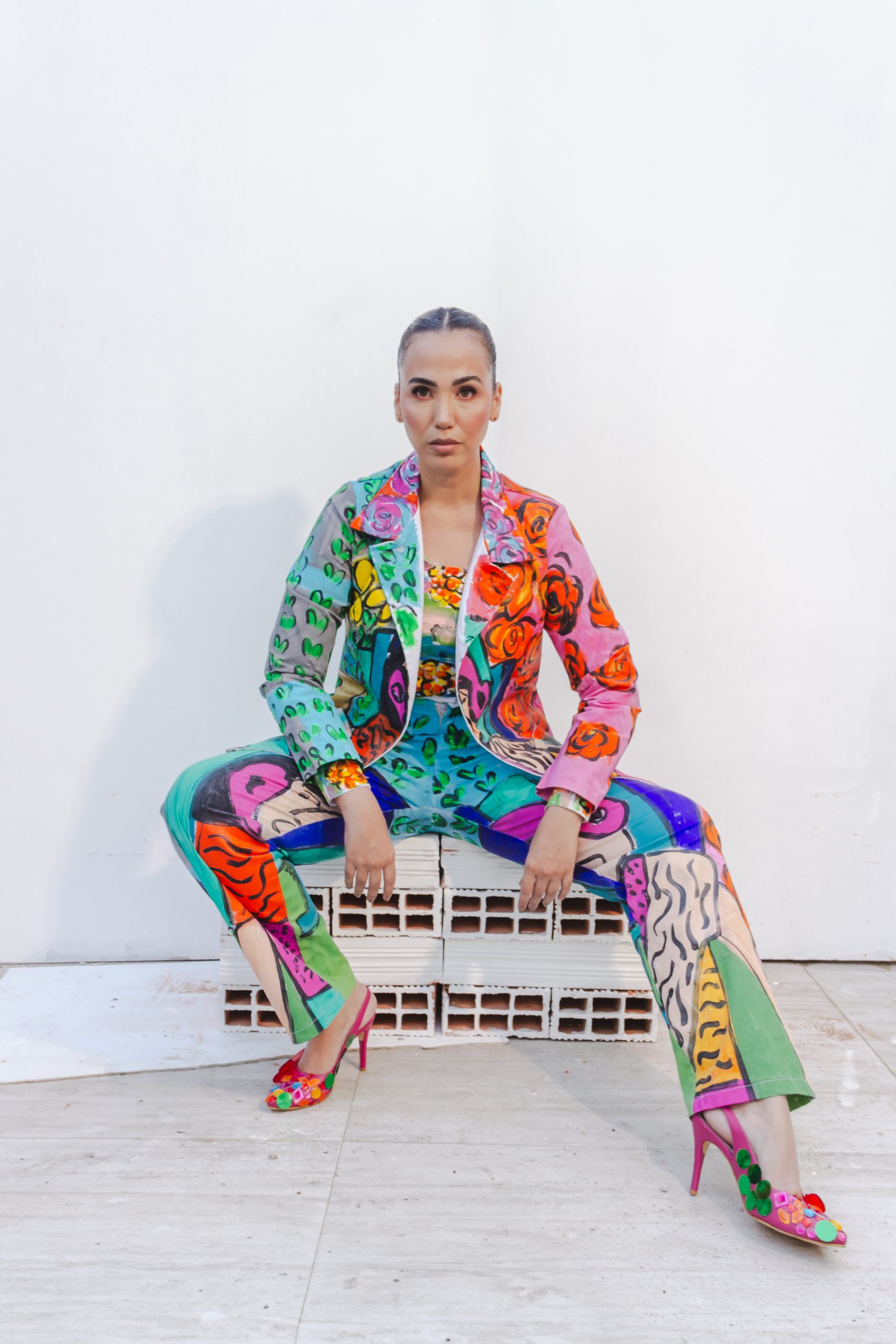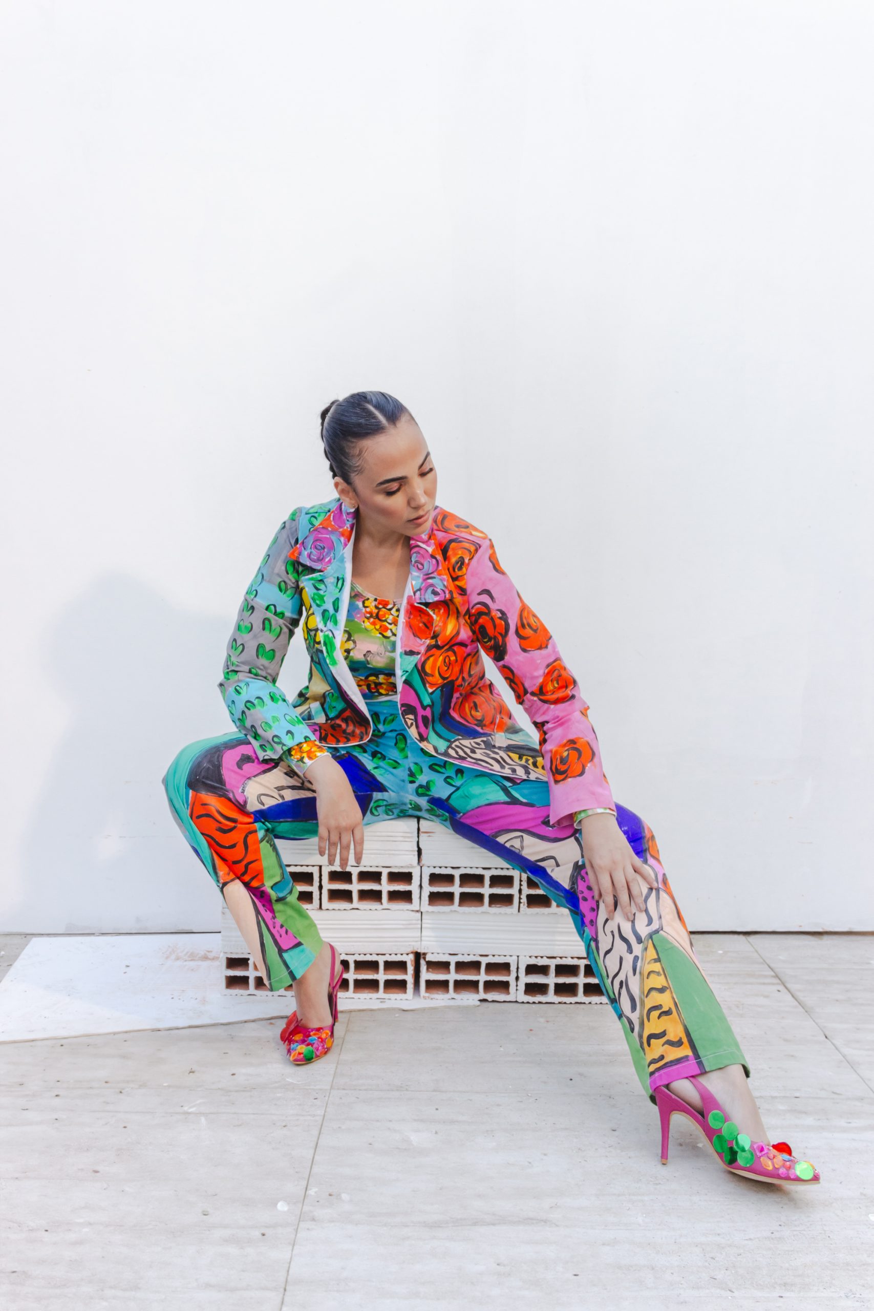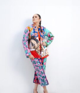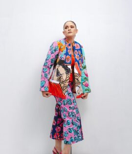 Grito Silencioso es una obra que encapsula la profunda dualidad entre la lucha interna y la apariencia externa. A través de un pantalón y blazer, se retrata la figura de la mujer de “Voces del Silencio”, con su rostro marcado por el dolor y la resistencia, expresado en su grito mudo. El conjunto está contrastado por un body de flores amarillas, simbolizando la esperanza que florece incluso en los momentos más oscuros.