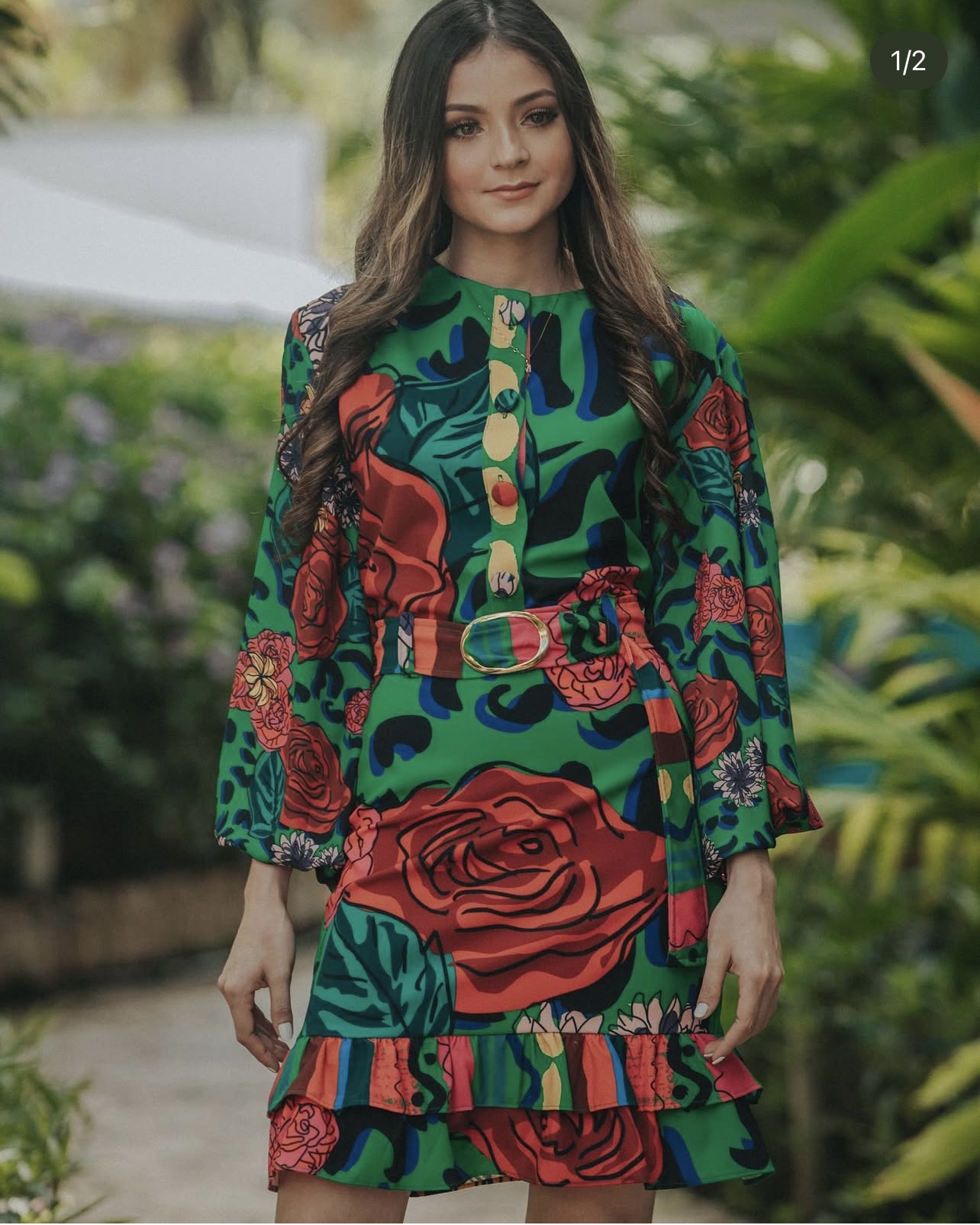 ELABORADO EN VIENA Y ATINA, CORTE A LA CINTURA Y PRETINA BLUSA CON CUELLO REDONDO Y MANGAS ABULLONADAS CON PUÑO RESORTADO, FALDA SILUETA AJUSTADA Y DOS BOLEROS, CON BOTONADURA FRONTAL, LA técnica ES SUBLIMACIÓN TEXTIL