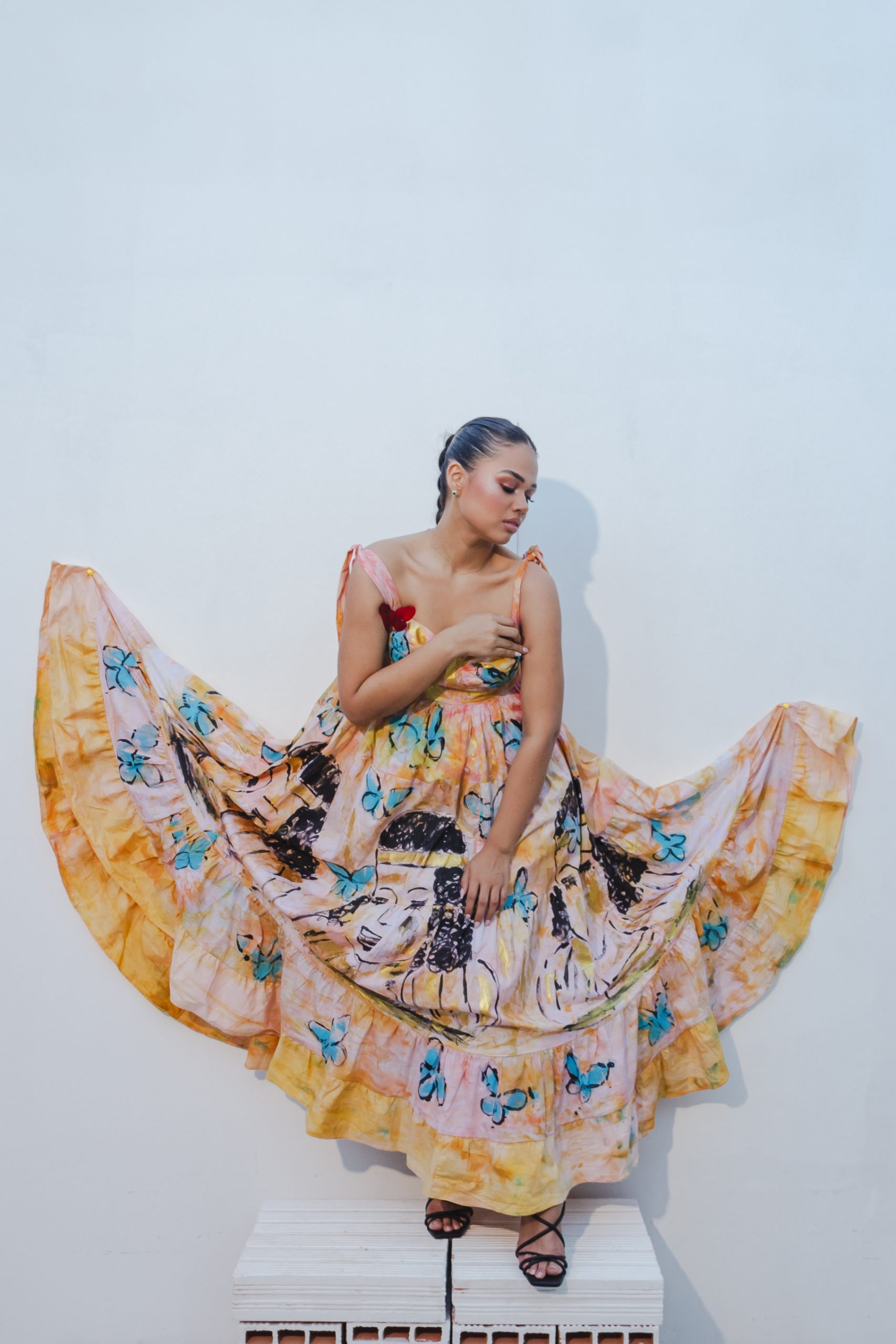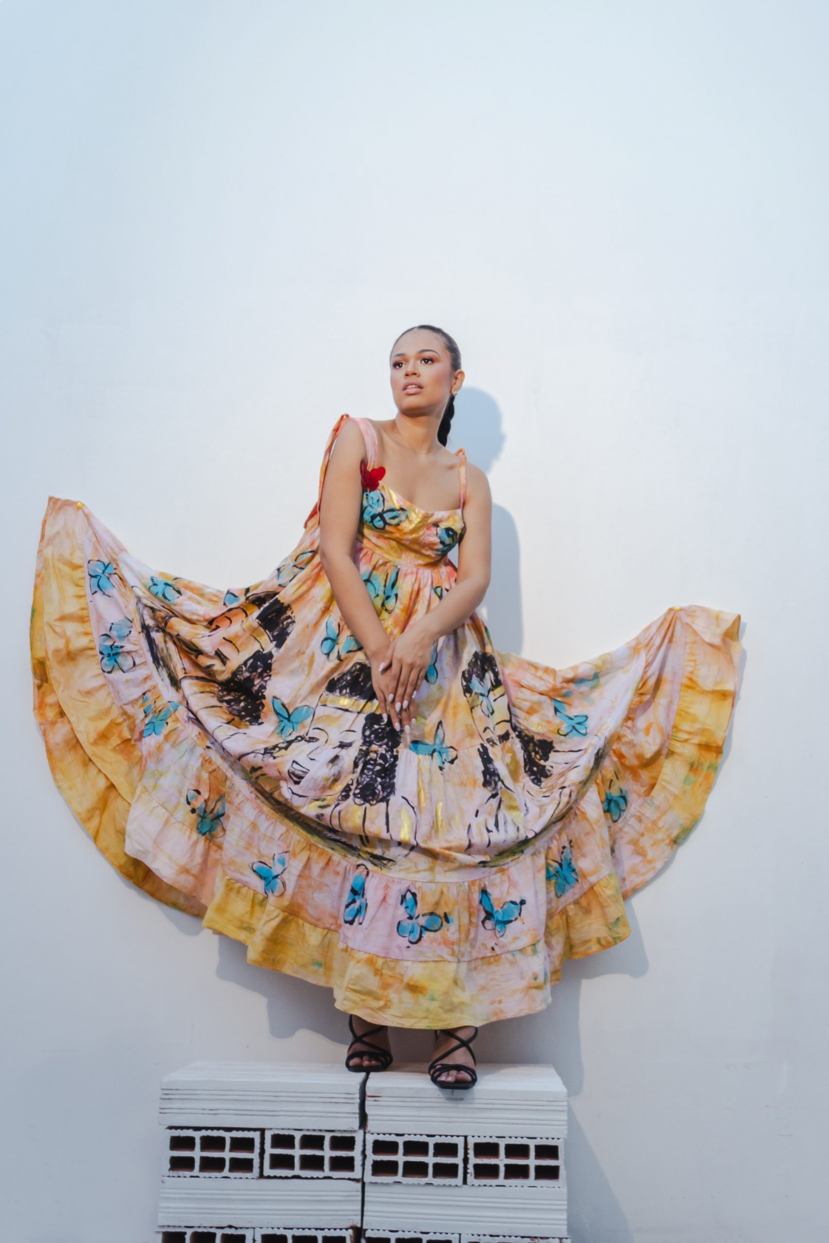 Alas de la Infancia” es un tributo a la felicidad y la magia de la niñez, evocando el amor y la alegría que una madre puede ofrecer. Este vestido largo, con corte princesa y detalles de amarres al hombro, utiliza la técnica de tie-dye en tonos cálidos de naranja, rosa y ocre, reflejando la calidez y el brillo de los recuerdos infantiles.