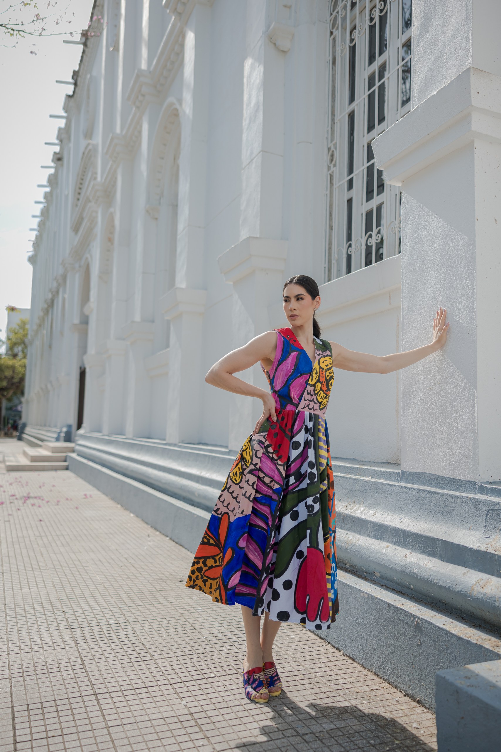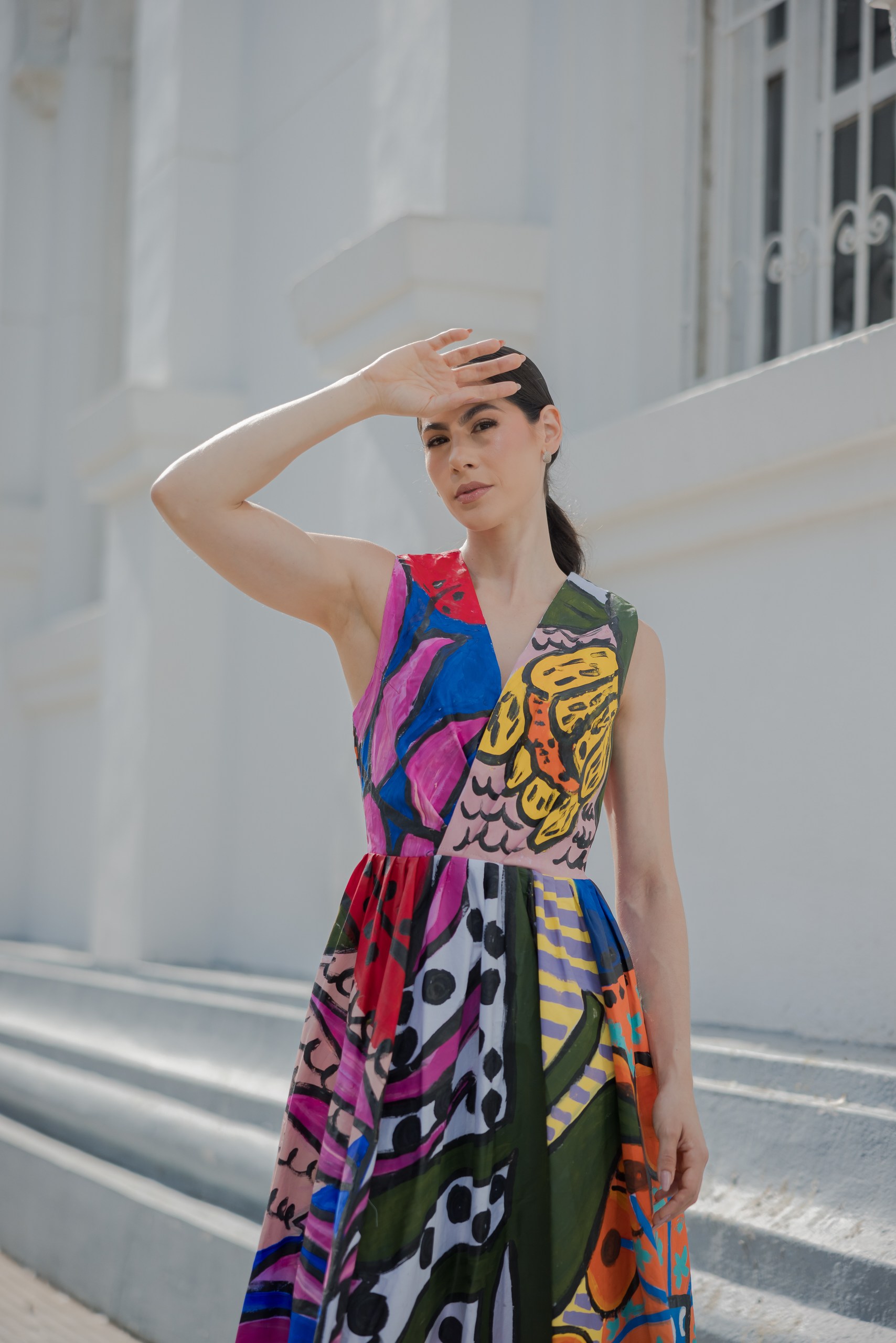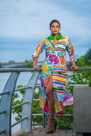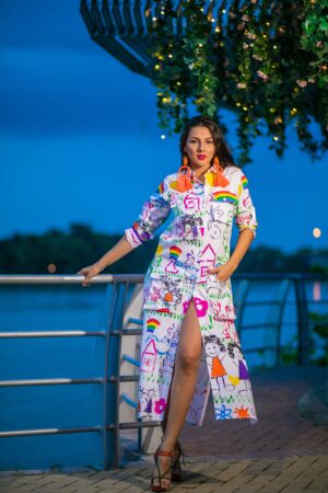 VESTIDO CON ESCOTE EN V, CON TRAZOS EXPRESIVOS PINTADO A MANO. CADA PIEZA ES UNA OBRA UNICA DONDE EL COLOR CUENTA UNA HISTORIA INTIMA DE RENACIMIENTO Y EMOCION.