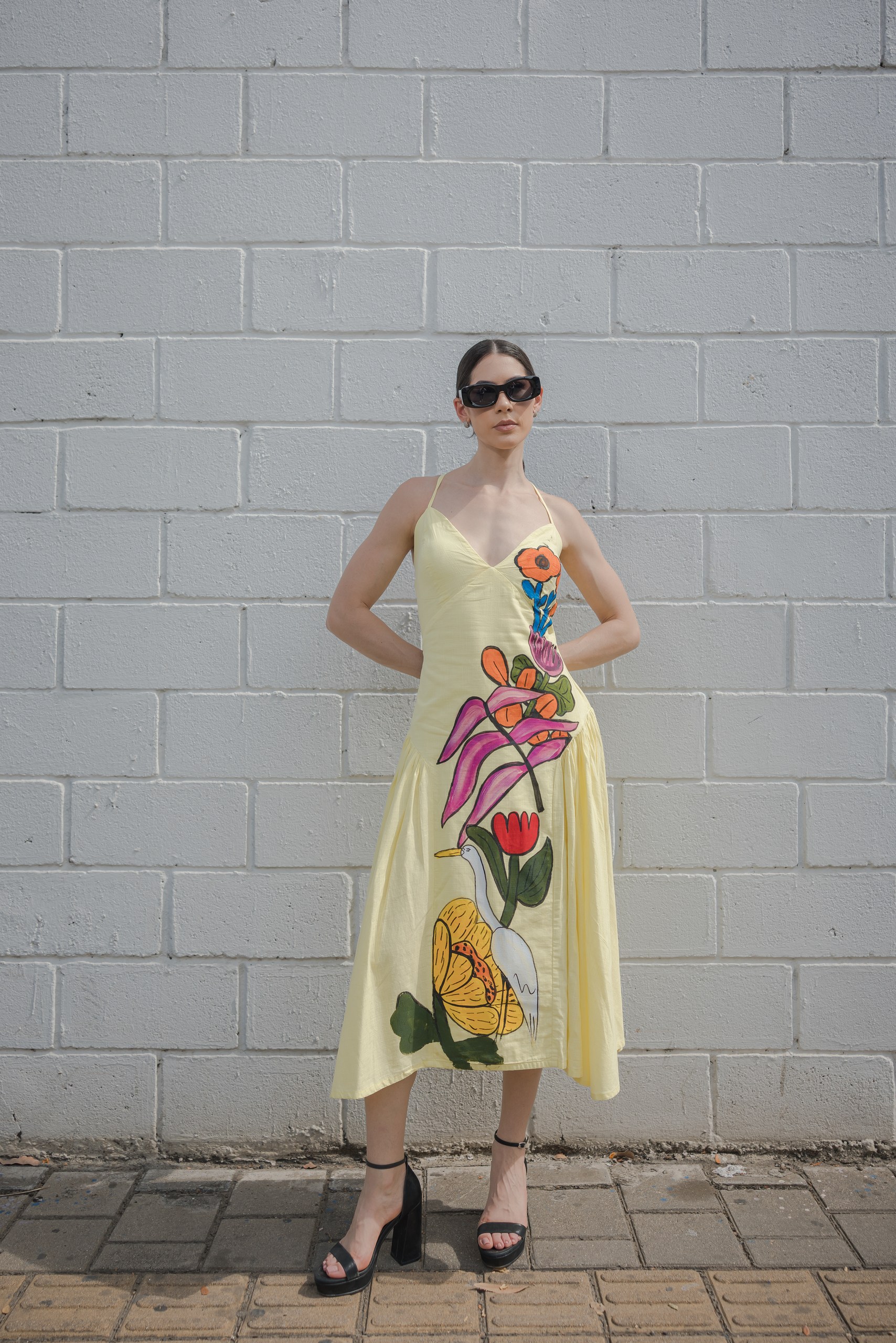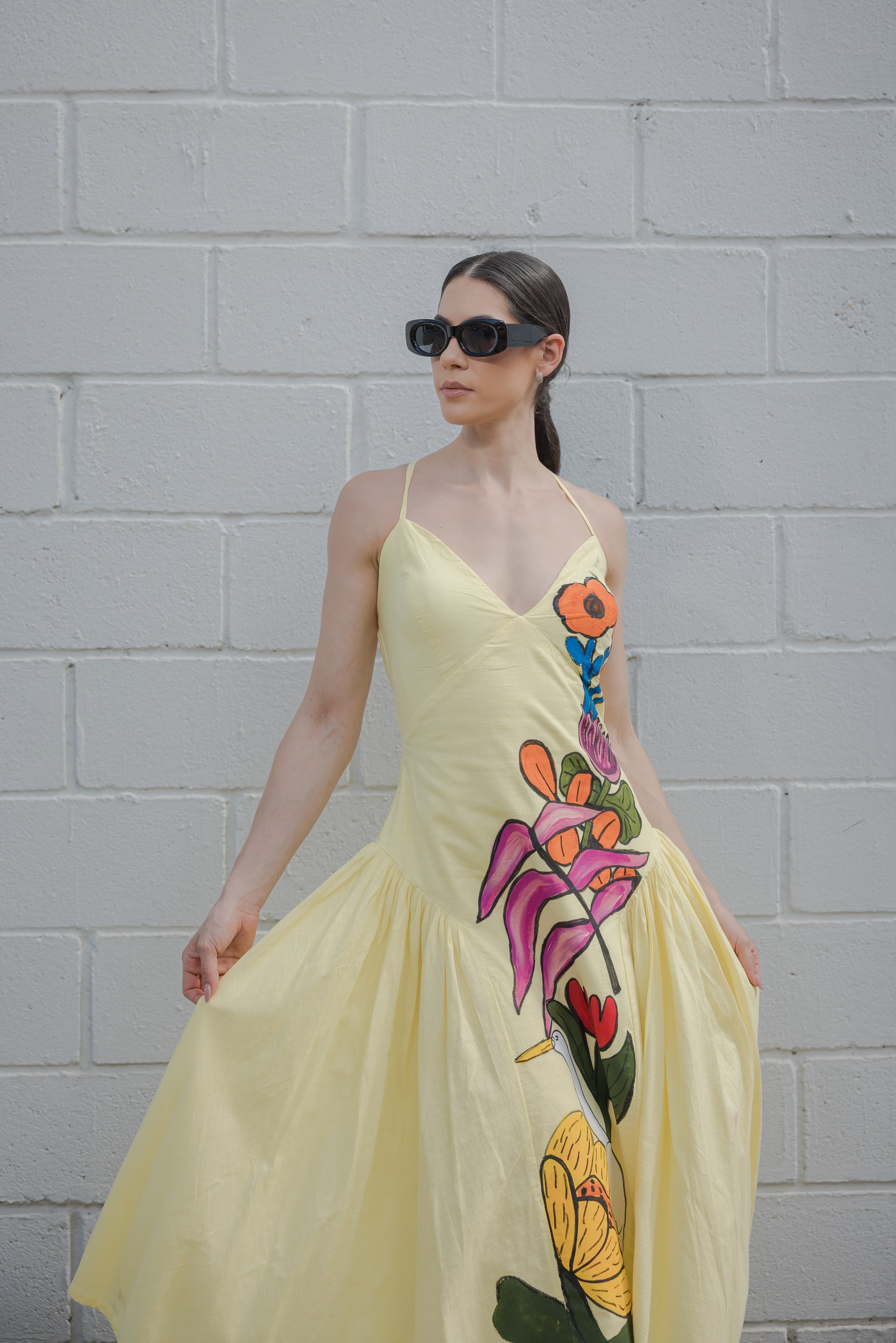 SILUETA CLASICA Y DETALLES PINTADOS A MANO, ESTE VESTIDO REUNE LA MAGIA DEL COLOR Y LA DELICADEZA ARTESANAL. PERFECTO PARA LAS MUJERES QUE IRRADIAN LUZ PROPIA.